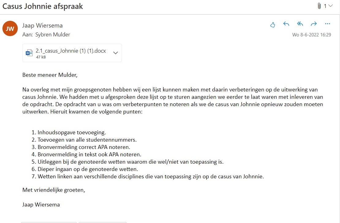 Wij kregen de opdracht om verbeterpunten te zoeken in de gemaakte casus van Johnny omdat wij nog geen beoordeling en feedback hadden over het gemaakte verslag.